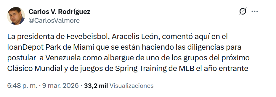 «La presidenta de Fevebeisbol, Aracelis León, comentó aquí en el loanDepot Park de Miami que se están haciendo las diligencias para postular a Venezuela como albergue de uno de los grupos del próximo Clásico Mundial», informó el periodista Carlos Valmore en un mensaje divulgado en sus redes sociales.