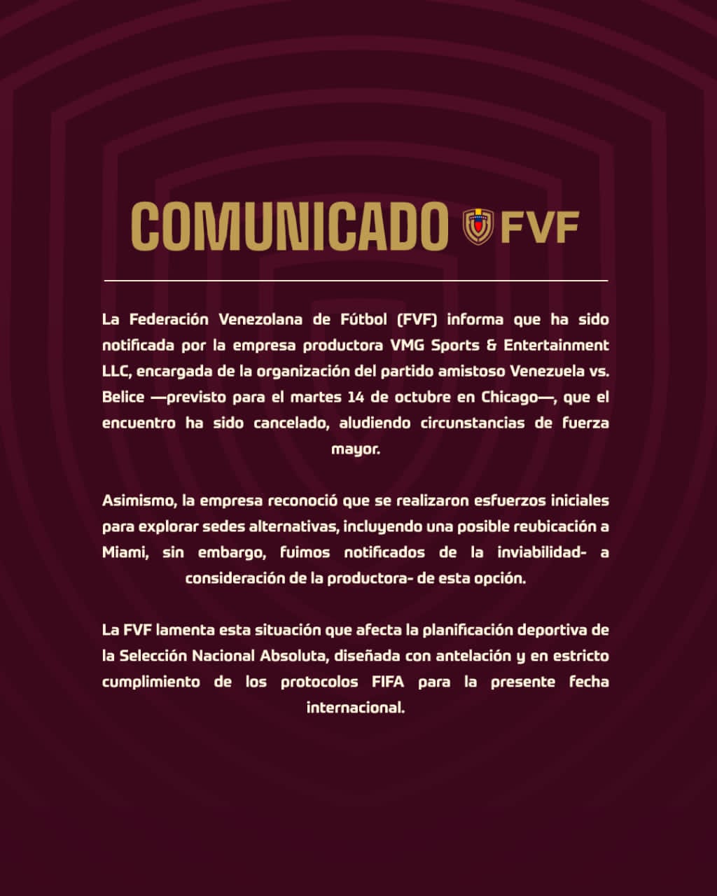 «La FVF lamenta esta situación que afecta la planificación deportiva de la Selección Nacional Absoluta, diseñada con antelación y en estricto cumplimiento de los protocolos FIFA para la presente fecha internacional», concluyó la misiva de la federación.