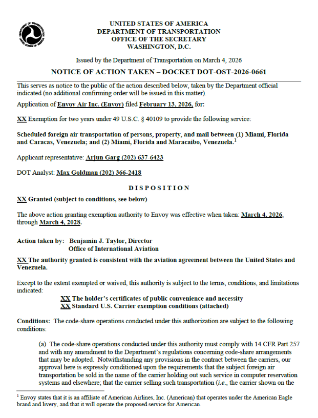 La autorización del USDOT tendrá una vigencia inicial de dos años, durante los cuales American Airlines podrá operar vuelos diarios hacia ambas ciudades venezolanas.