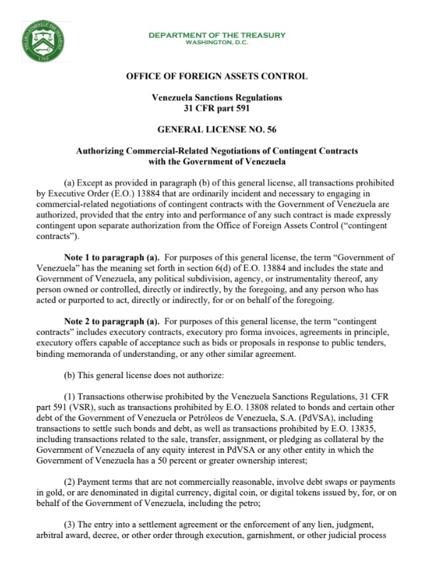 Se detalló que las dos licencias emitidas, firmadas por Bradley T. Smith, director de la OFAC, también autorizan acuerdos relacionados con contratos contingentes vinculados al Gobierno venezolano, siempre que su ejecución quede sujeta a una aprobación independiente por parte de las autoridades estadounidenses.