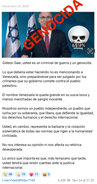 «Gideon Saar, usted es un criminal de guerra y un genocida. Lo que debería estar haciendo no es mencionando a Venezuela, sino preparándose para ser juzgado por los crímenes que su gobierno comete contra el pueblo palestino. El nombre Venezuela le queda grande en su sucia boca y manos manchadas de sangre inocente», manifestó.