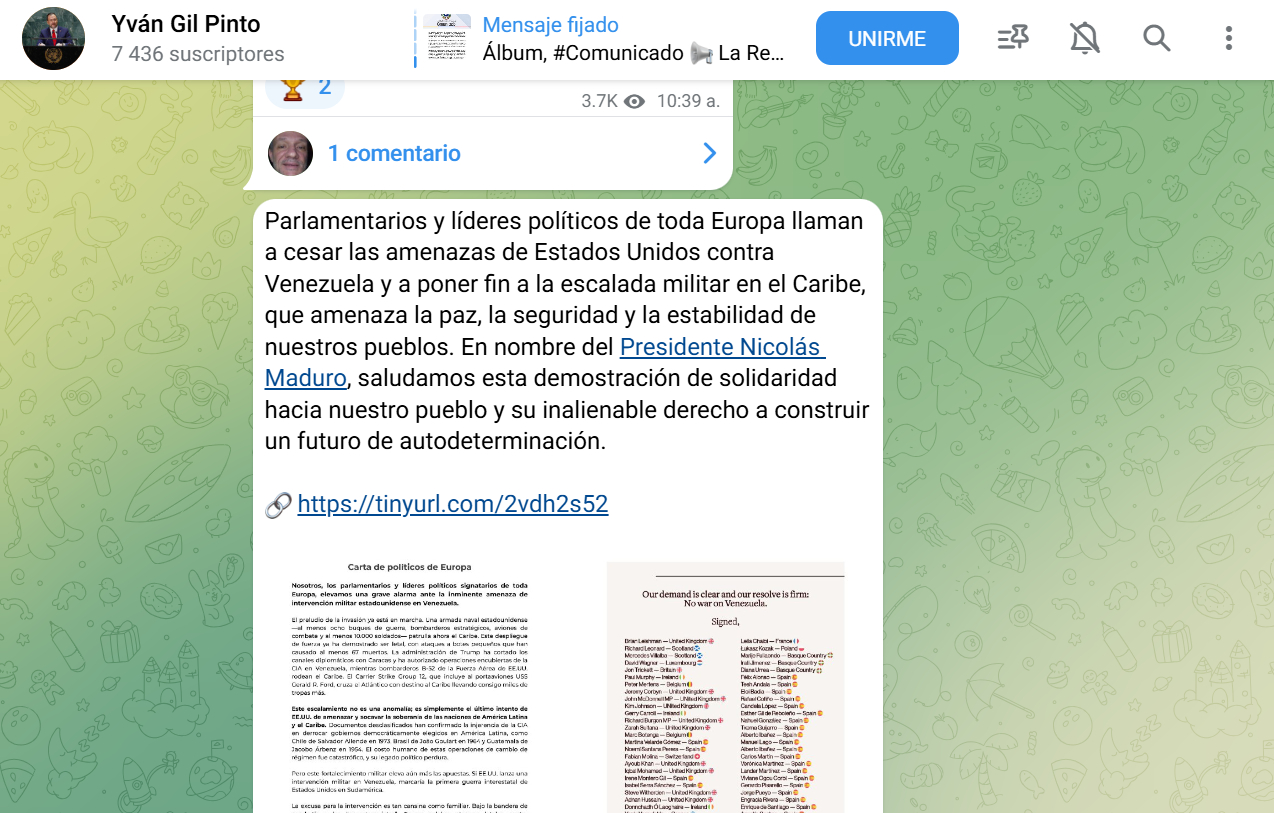 «Parlamentarios y líderes políticos de toda Europa llaman a cesar las amenazas de Estados Unidos contra Venezuela y a poner fin a la escalada militar en el Caribe, que amenaza la paz, la seguridad y la estabilidad de nuestros pueblos», agregó.