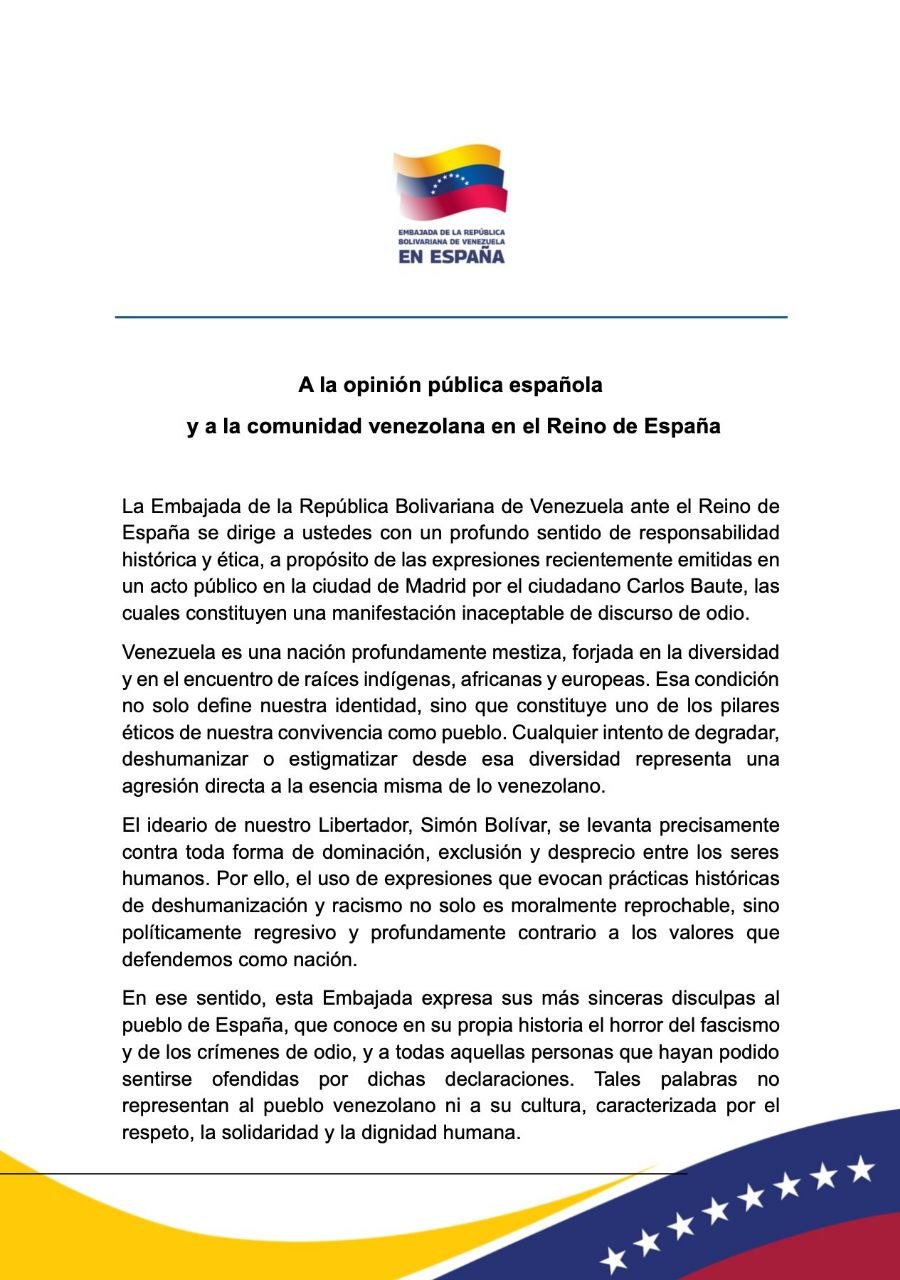 «Ofrecemos nuestras más sinceras disculpas al pueblo de España y a la comunidad internacional por estas expresiones de deshumanización», reza el comunicado. La legación diplomática subrayó que este tipo de retórica «no representa el sentir, la cultura ni la educación del pueblo venezolano», lamentando que se utilicen espacios públicos en España para promover la violencia política.