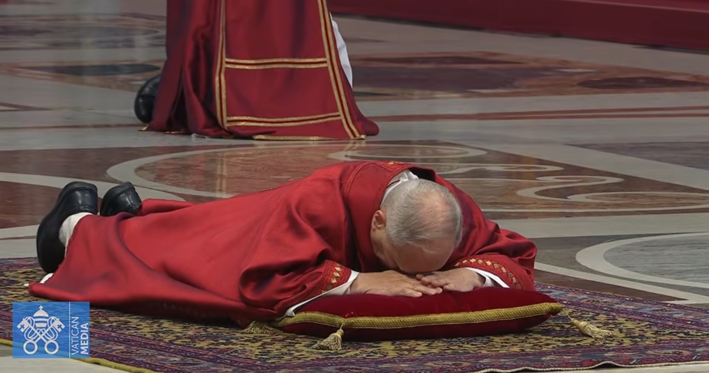 El pontífice, vestido con los paramentos rojos símbolo del martirio, empezó la ceremonia tumbado completamente sobre una alfombra ante el Altar de la Confesión, que marca el lugar exacto en el que, según la tradición, fue sepultado el apóstol Pedro.