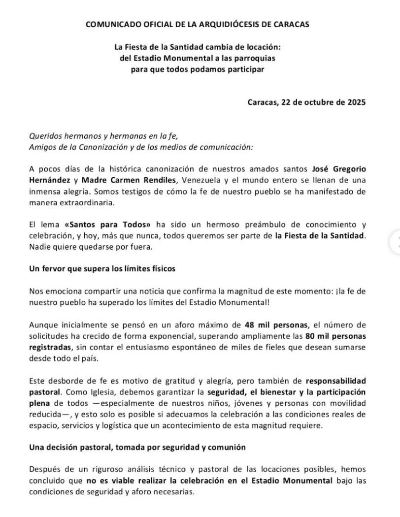 La Arquidiócesis de Caracas informó que la celebración por la canonización de los dos santos venezolanos ya no se llevará a cabo en el estadio Monumental de Caracas.