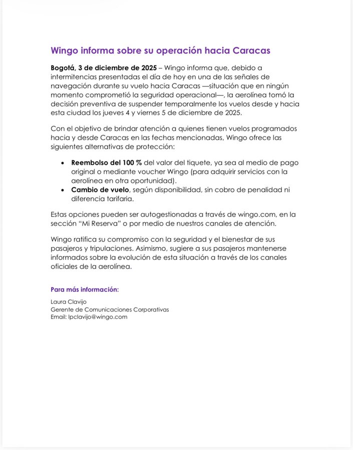 «Debido a intermitencias en una señal de navegación reportada hoy por nuestros pilotos, y que no comprometieron la seguridad, se suspenden de forma preventiva los vuelos desde y hacia Caracas el 4 y 5 de diciembre de 2025. Estamos evaluando la situación y compartiremos nueva información en nuestros canales públicos en las próximas 24 horas», indicó Copa.