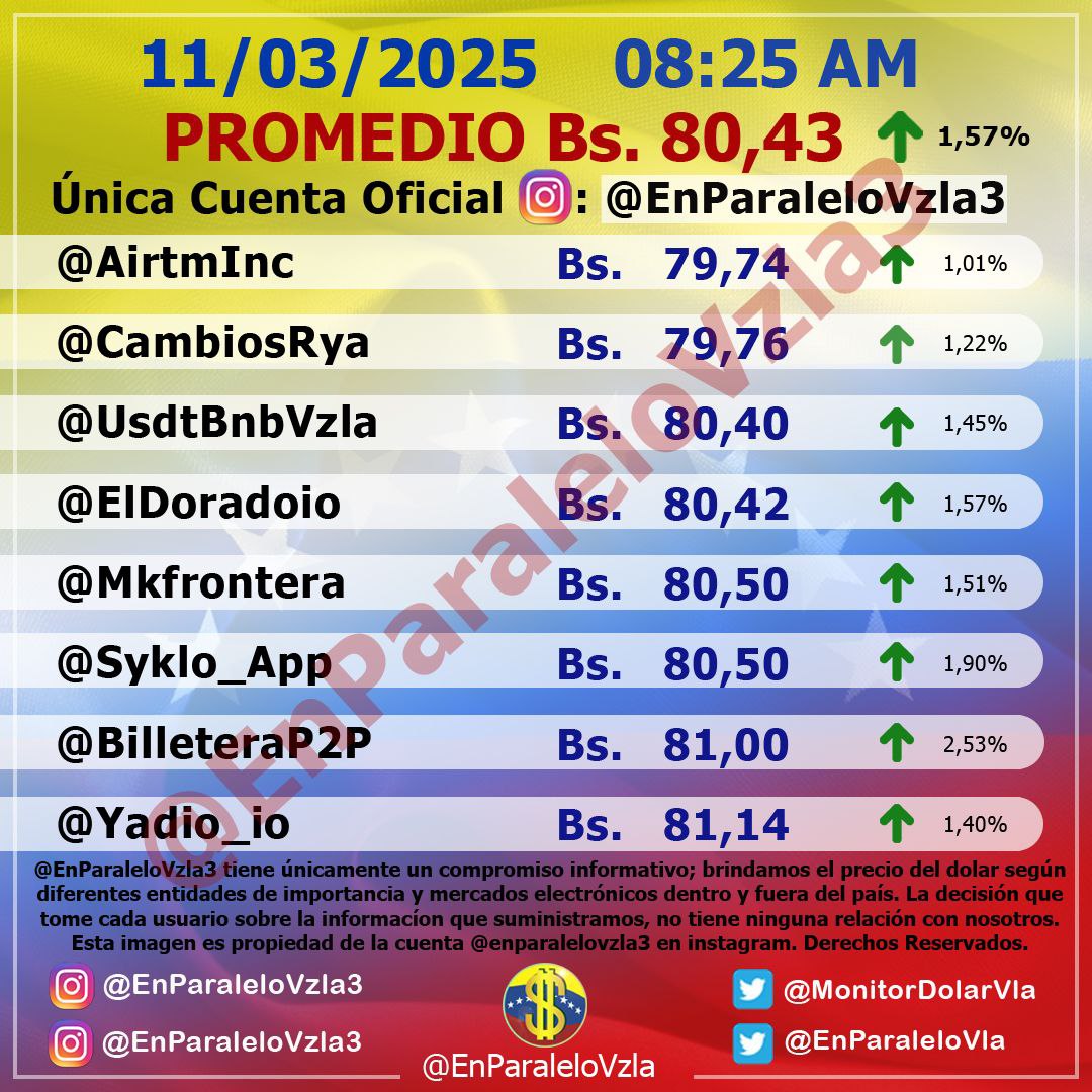 Las ocho cuentas que promedia este marcador del dólar paralelo (@UsdtBnbVzla, @ElDoradoio, @CambiosRya, @Mkfrontera, @BilleteraP2P, @Yadio_io, @Syklo_App y @AirtmInc) registraron comportamiento positivo al subir entre 1,01 % y 2,53 %.