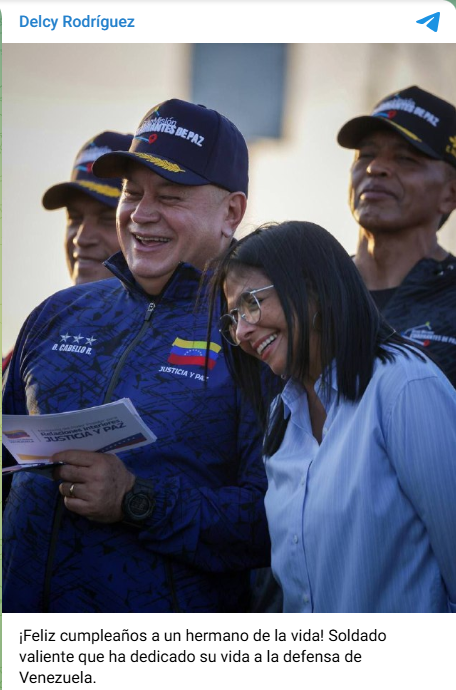 La presidenta encargada Delcy Rodríguez felicitó este miércoles al ministro de Interior, Justicia y Paz, Diosdado Cabello, por su cumpleaños.