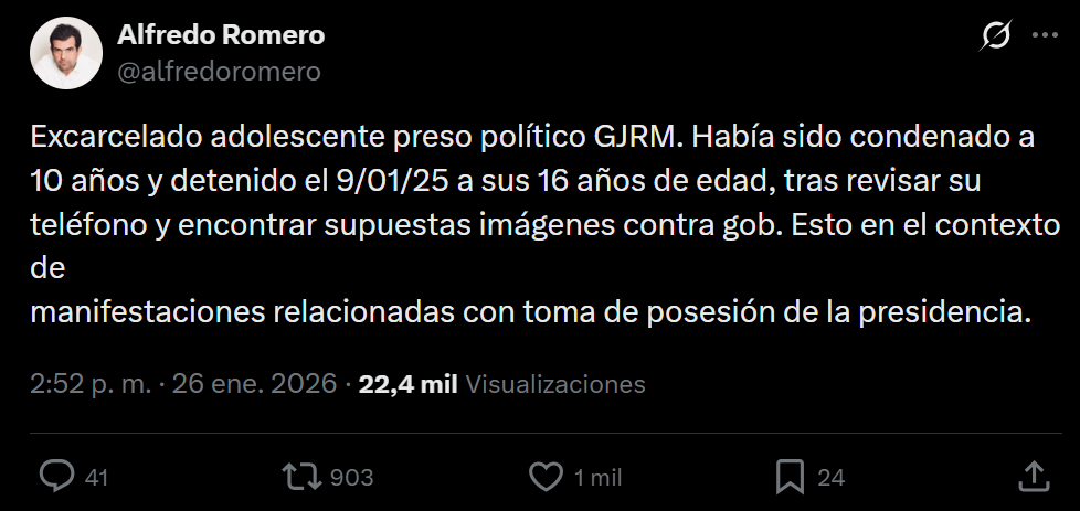 «Había sido condenado a 10 años y detenido el 9/01/25 a sus 16 años de edad, tras revisar su teléfono y encontrar supuestas imágenes contra el gobierno. Esto en el contexto de manifestaciones relacionadas con la toma de posesión de la presidencia», dijo Romero.