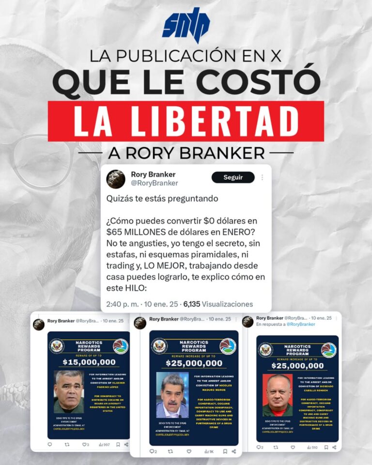 El SNTP, que llevaba varios meses exigiendo la liberación de Branker, informó el sábado que el comunicador habría sido detenido por compartir imágenes con las que Estados Unidos ofrecía recompensas a cambio de información que llevara a la captura de Nicolás Maduro, Diosdado Cabello y Vladimir Padrino López.