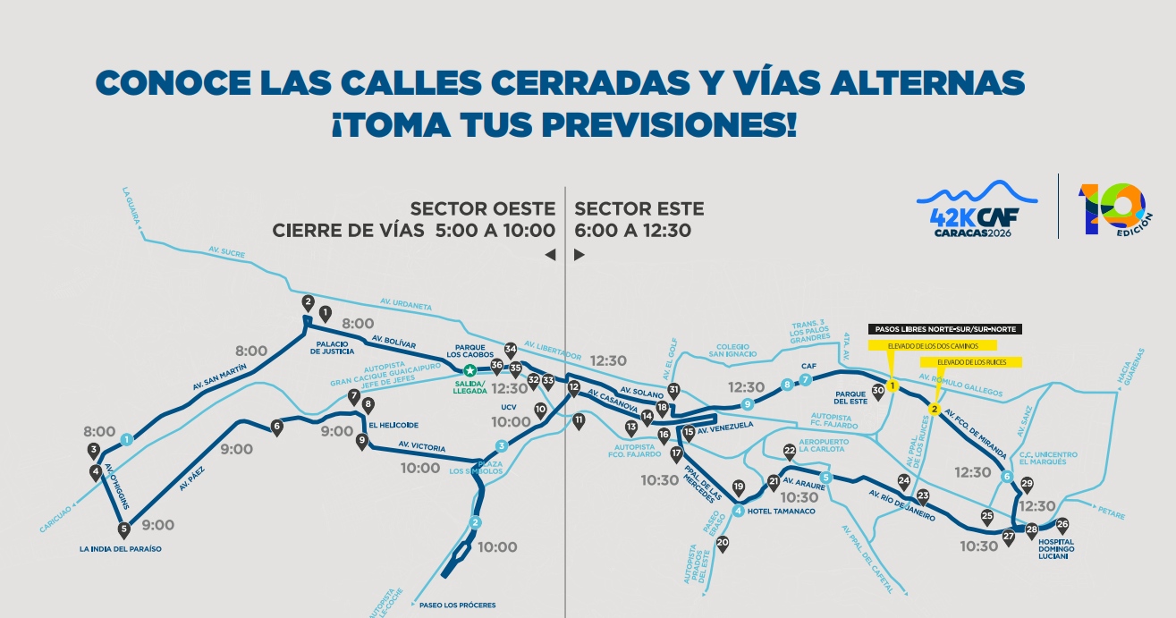 El Maratón CAF contará con distancias de 42, 21 y, por primera vez, 10 kilómetros. El Parque Sucre Los Caobos, desde donde saldrán los corredores, tendrá acceso libre para todo el público general.