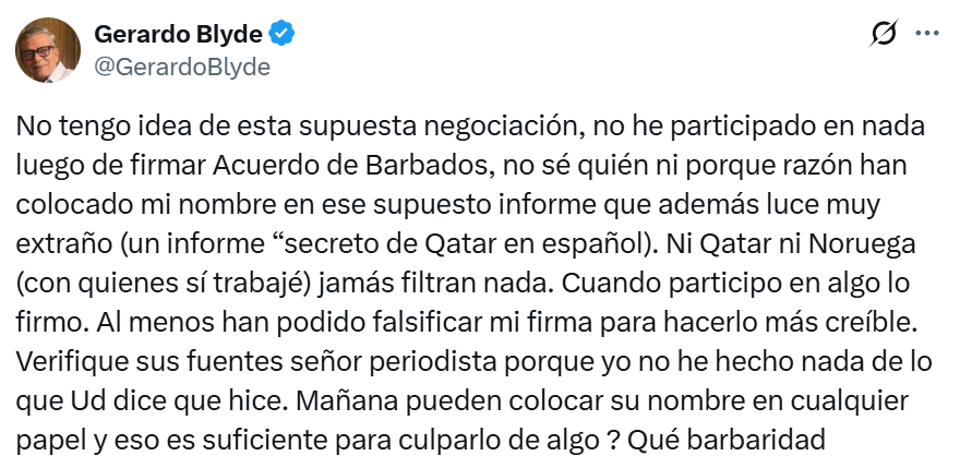 «No tengo idea de esta supuesta negociación, no he participado en nada luego de firmar Acuerdo de Barbados, no sé quién ni porque razón han colocado mi nombre en ese supuesto informe que además luce muy extraño, un informe ‘secreto de Qatar en español'», comentó.