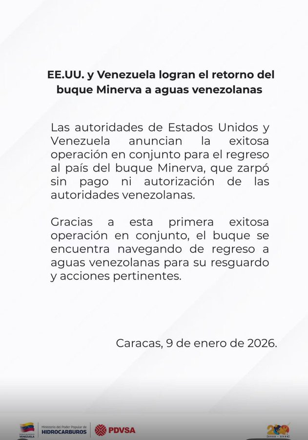 «Las autoridades de Estados Unidos y Venezuela anuncian la exitosa operación en conjunto para el regreso al país del buque Minerva. Zarpó sin pago ni autorización de las autoridades venezolanas», indicó la estatal en un comunicado.